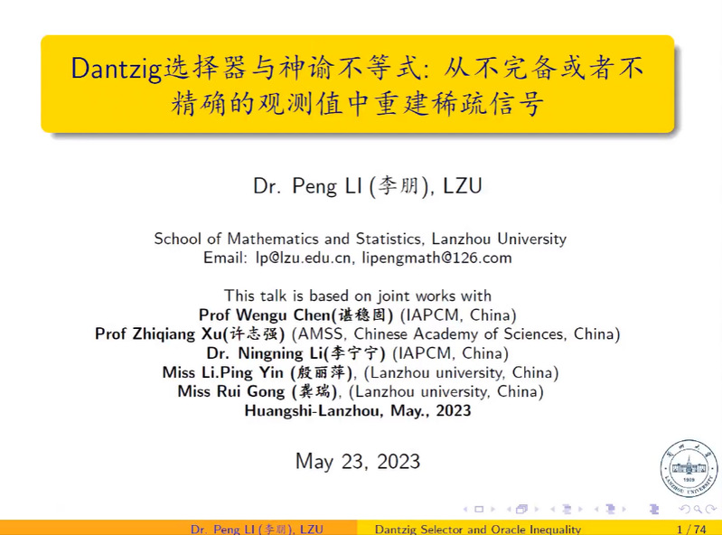 2023年5月23日下午6:30-8:30, 兰州大学李朋副教授通过腾讯会议线上为 成人网 师生主讲了题为“The Dantzig Selector and Oracle Inequality: Signal Recovery from Incomplete and Inaccurate Measurements”的学术报告. 报告会由左可正教授主持, 基础数学和计算数学的老师及其研究生共同在10803教室聆听.