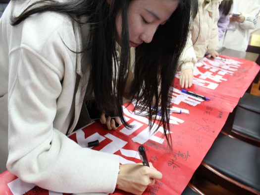 活动最后,参会同学依次在诚信标语横幅上签名。