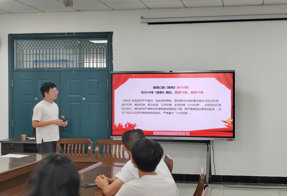 党员杨宇森老师就本次微党课讲授的学习内容分享个人体会,接着党员尚冰同志就查摆问题做出自我批评与改进。会议最后,屈媛媛老师和杨宇森老师为各位党员开展党纪学习教育,将中国共产党纪律处分条例内容与具体实例相结合,希望各位党员同志严以修身,坚定党性,把党的纪律内化为日用而不觉的言行准绳,强化自我约束,促进担当作为,积极做到学纪知纪明纪守纪,切实把学习成果转化为推动高质量发展的实际行动。