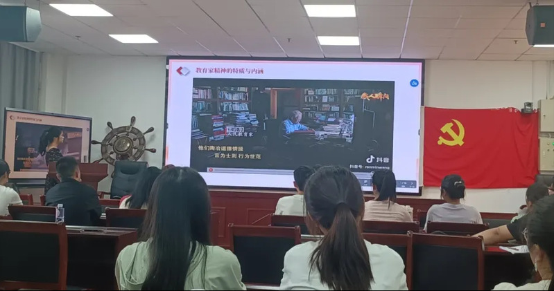 在党课学习的环节,付娆同志从时代需要教育家精神,教育家精神的特质与内涵,以及如何践行教育家精神等方面讲述一名优秀的党员应当遵从教育家精神,铸牢信念之基,扎下从教立身之根。付娆同志强调,教育家精神不仅体现在言传身教,更在于以身作则,将全会精神与日常教学相结合,以实际行动肩负起培养社会主义建设者和接班人的使命。学生党员徐宏飞从观看教育家精神后的自身感触出发,认为身为学生党员应当在日常生活中贯彻落实教育家精神,在实践中践行教育家精神。