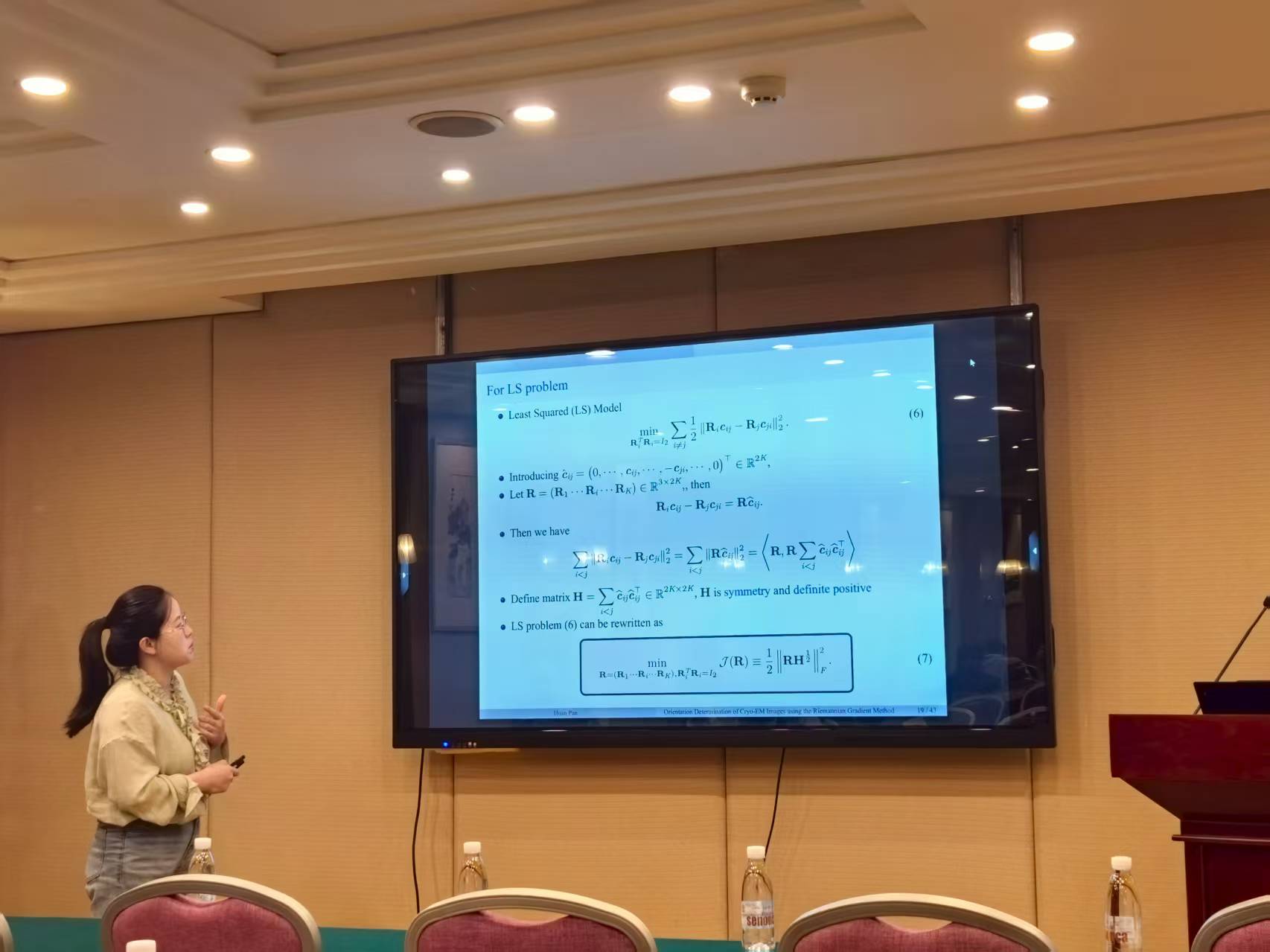 在9月20日上午的分组报告环节中,潘欢做了题为《Orientation Determination of Cryo-EM Images using the Riemannian Gradient Method》的学术报告。报告中,她聚焦于冷冻电镜图像的投影方向估计这一关键问题,详细阐述了如何运用黎曼梯度法来精准估计冷冻电镜图像的投影方向,并通过一系列严谨的数值实验,有力地验证了所提出方法的有效性。当下,数学、统计学、图像处理技术与冷冻电镜成像技术的交叉融合,正逐步成为现代结构生物学发展的关键方向之一,为生物技术和精准医学的进步注入强大动力。