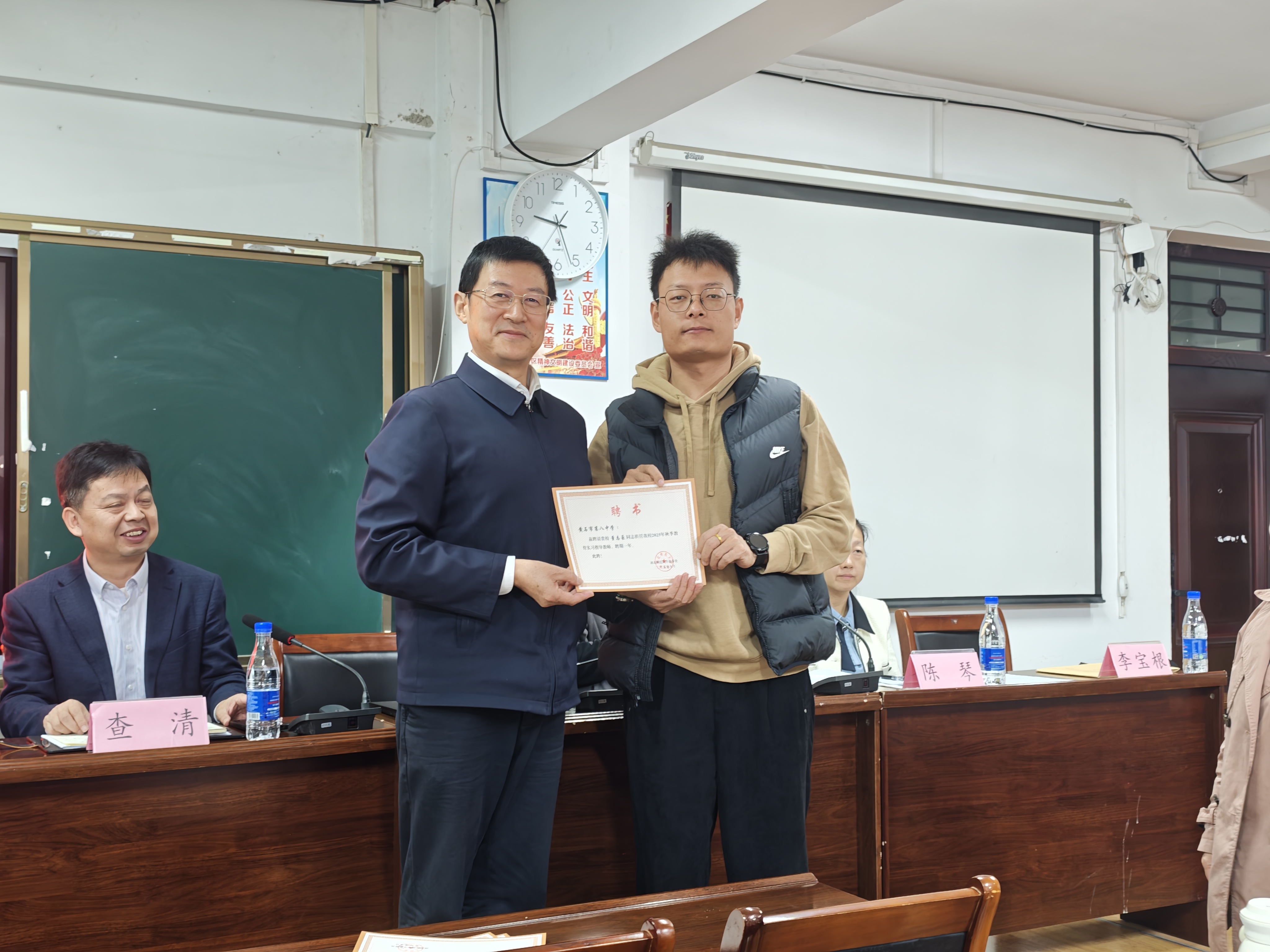 会后,余翔为黄石八中实习指导教师颁发指导老师聘书,感谢他们“倾囊相授、严慈相济”的付出。