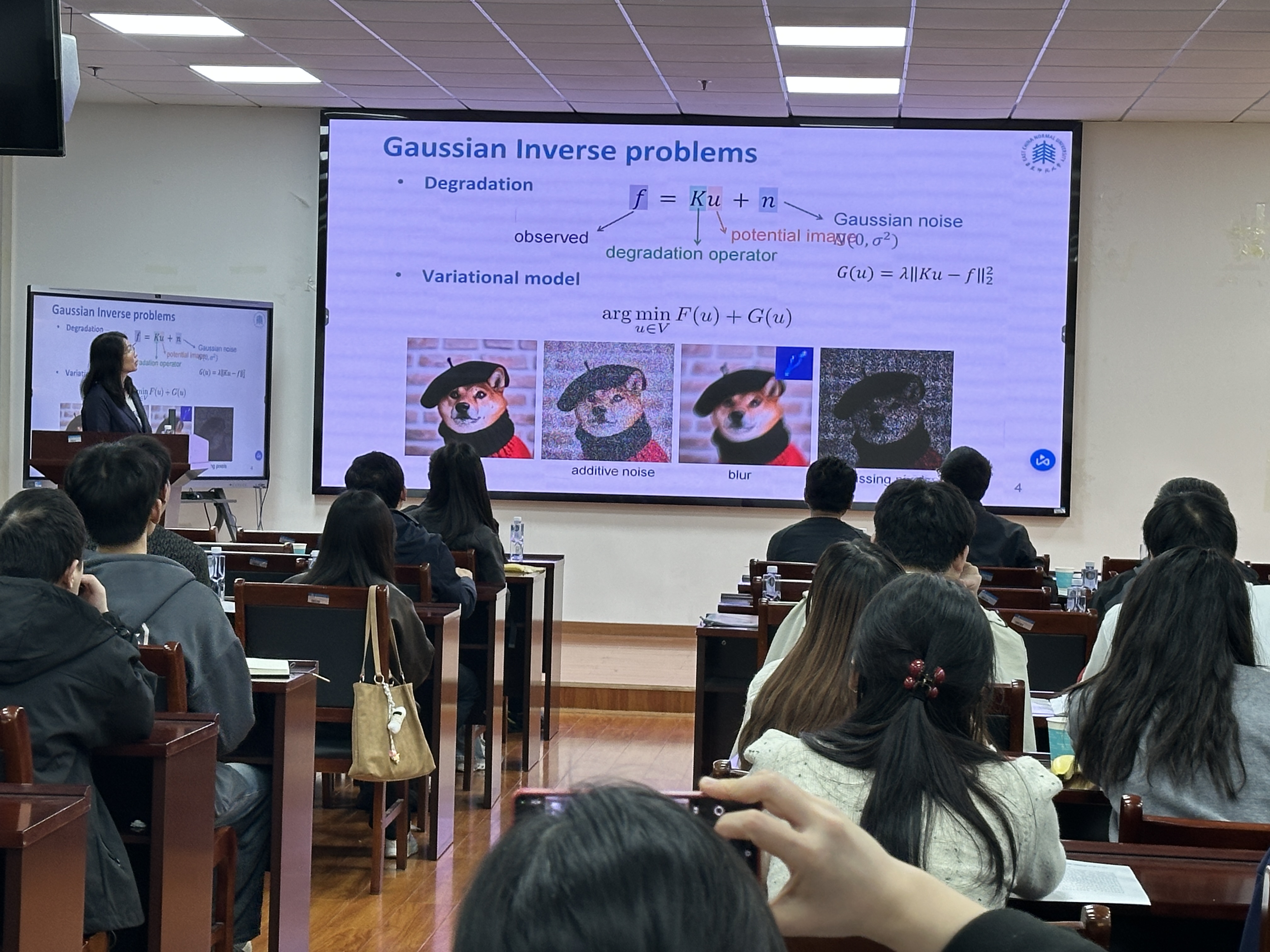 东北师范大学刘俊副教授以《Regularization for image deblurring》为题作学术报告。图像去模糊是图像处理的基础问题,正则化函数的有效选择仍是研究热点,而盲图像去模糊因潜在图像与模糊核对数量无限,挑战性尤为突出。不同于现有依赖统计观察的工作,其核估计方法基于内在几何考量。针对现有先进方法在高噪声场景下表现不佳、噪声会破坏模糊核估计准确性的问题,团队提出噪声鲁棒盲去模糊方法,在核估计中引入引导滤波抑制噪声,该方法在高噪声水平下的定量与定性表现均优于近年多款同类方法。