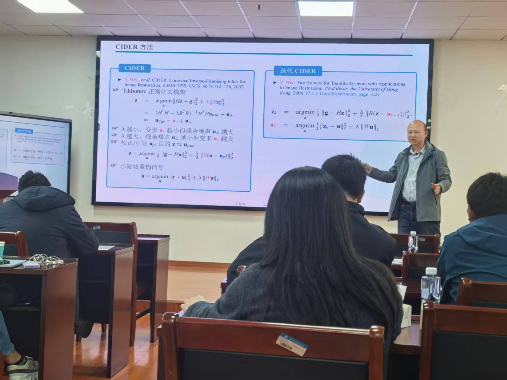 湖南师范大学文有为教授以《图像反问题中正则化参数选取理论及方法》为题作学术报告。图像反问题作为从观测数据恢复真实图像信息的核心技术,在计算机视觉、智能制造及医学成像等前沿领域有着广泛的应用价值。自适应正则化变分法是求解图像反问题的关键手段,其性能优劣直接取决于求解过程中正则化参数的自适应调整能力:参数选取不当易导致图像过度平滑或噪声残留。本报告将聚焦图像反问题的自适应正则化方法,阐述正则化参数的自适应选取逻辑。